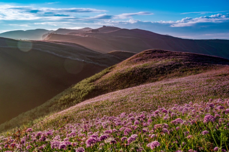 高原草原景观,草原辽阔,绿草如茵,风车林立,可徒步、骑马、露营,感受“风吹草低见牛羊”的高原风光。